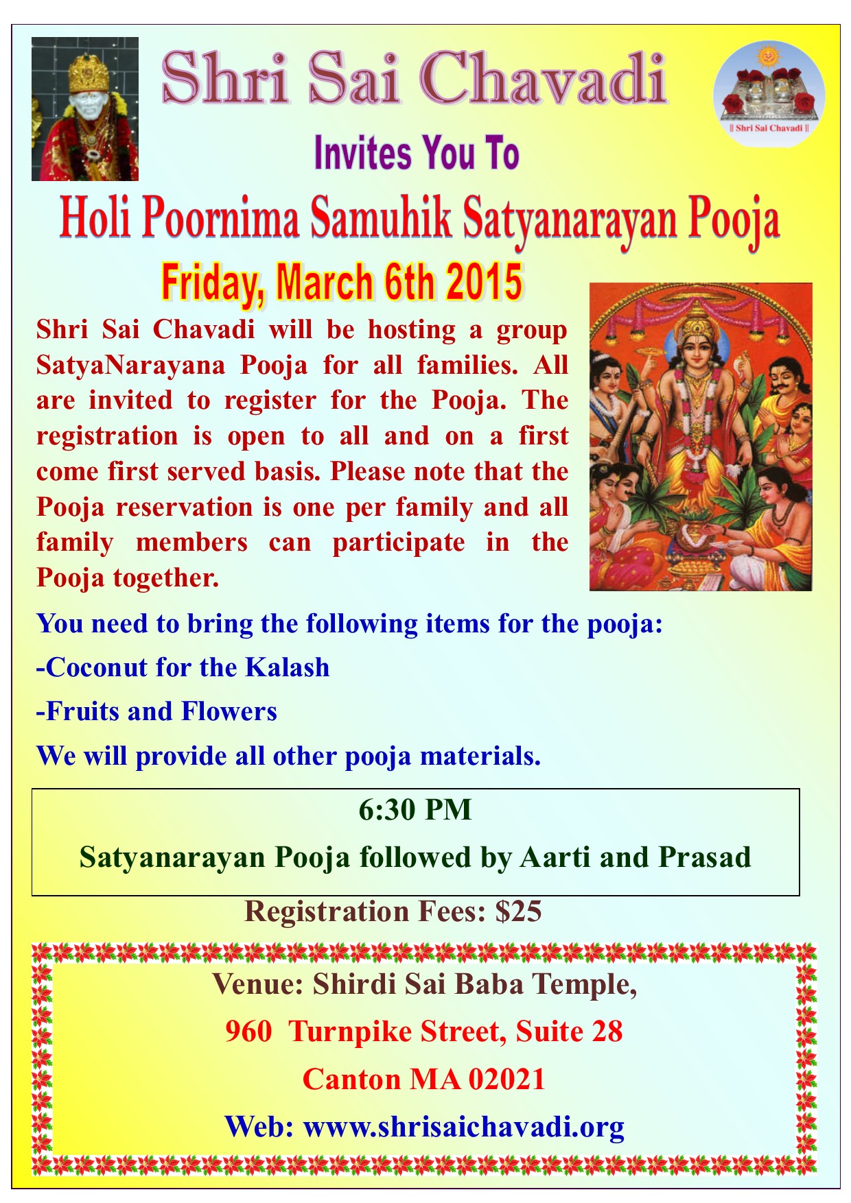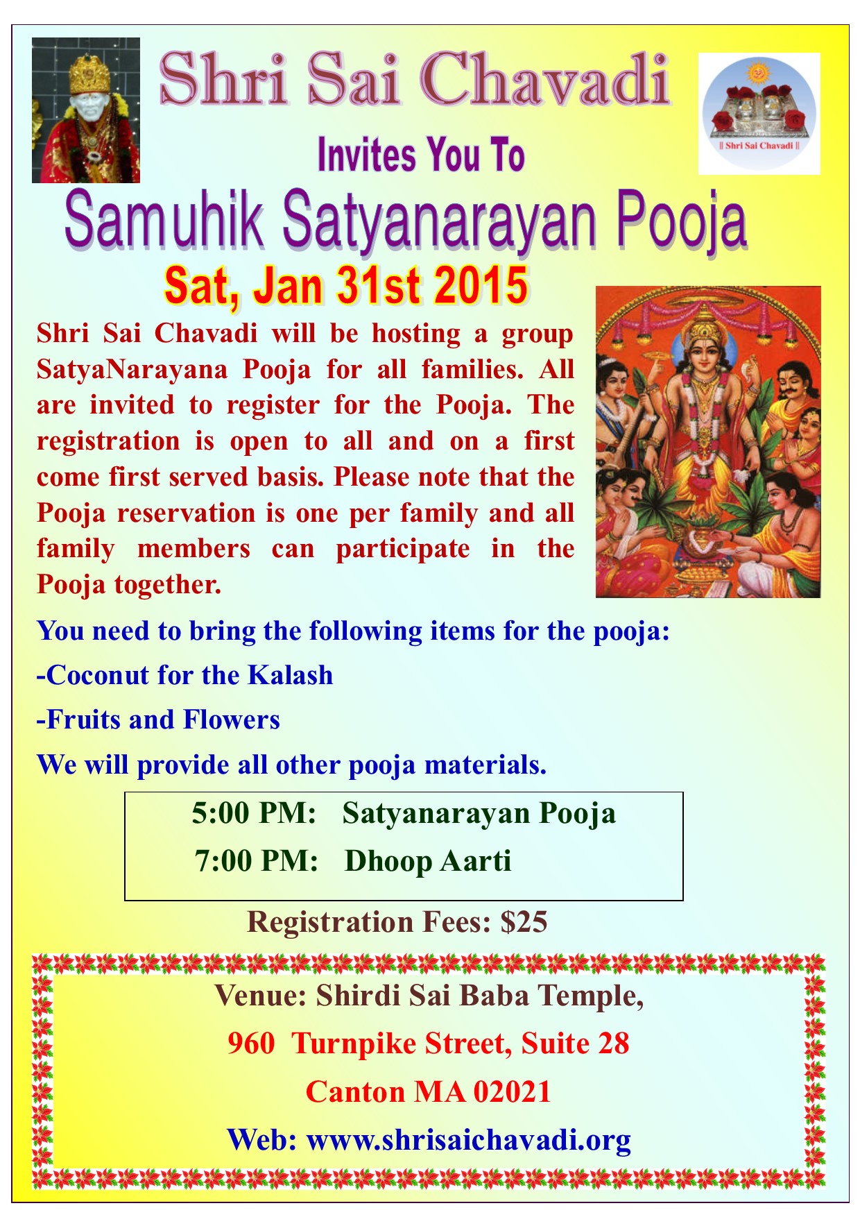 All are invited for Monthly Samuhika SatyaNarayana Pooja. Registration fee is $25 per family.