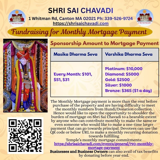 Please donate monthly towards the mortgage of the property purchased for Shri Sai Chavadi temple.
